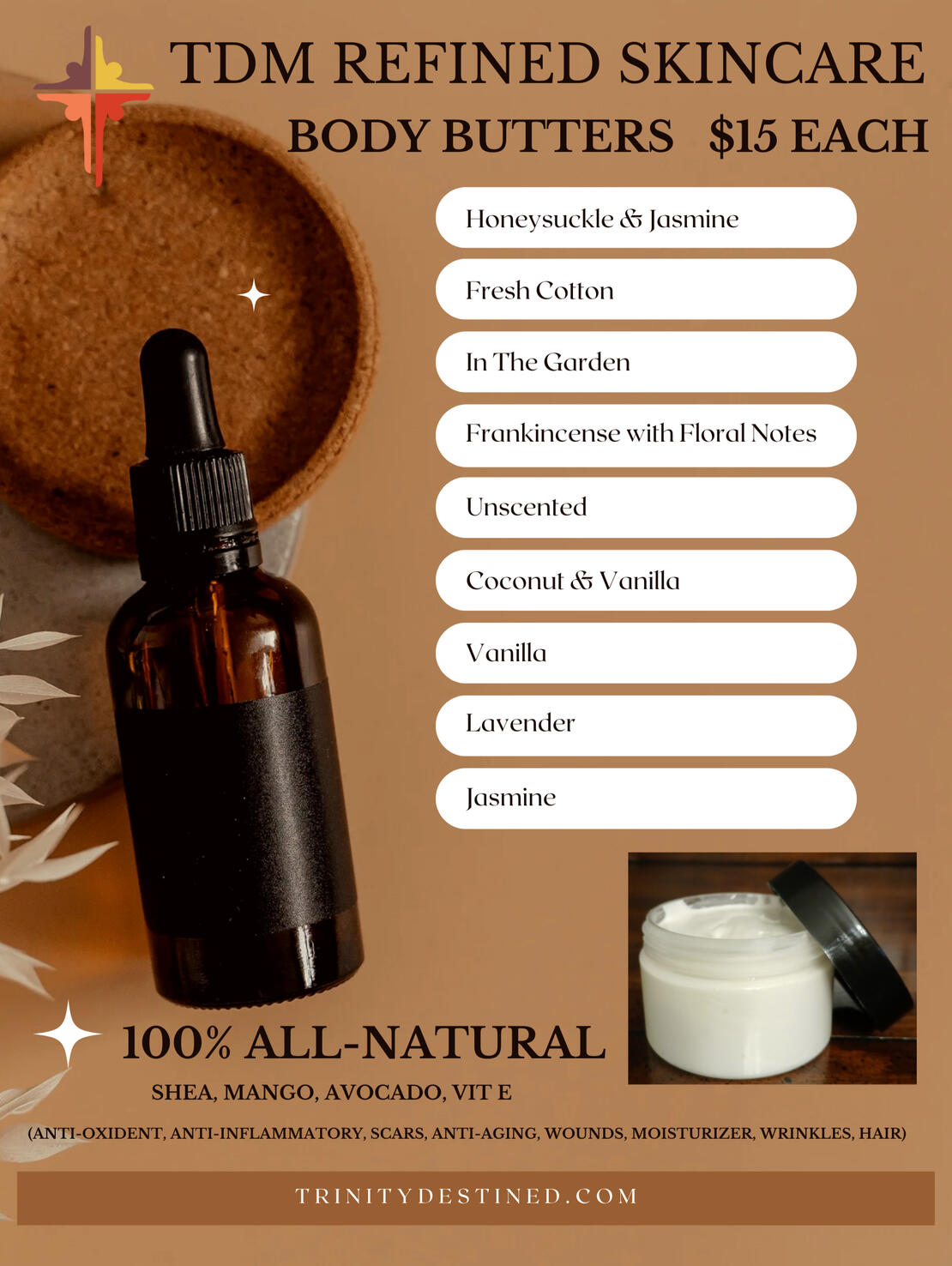 TDM Refined Skincare is all-natural skincare that is homemade to provide the right combination of butters for the most effective results on your skin. Not only does the body butters offer fantastic scents, they also contain anti-oxident and anti-inflammatory properties. As a deep moisturizer, it aids in addressing wrinkles, scars, and wound-healing.SCENTS: Honeysuckle & Jasmine, Fresh Cotton, In the Garden, Frankincense with Floral Scents, Coconut & Vanilla, Vanilla, Lavender, Jasmine and Unscented.Go to SHOP.TRINITYDESTINED.COM$15.00 each 4oz bottle